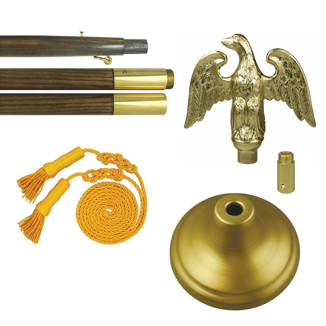 8′ DELUXE INDOOR MOUNTING SET – 8′ X 1-1/8″ OAK POLE, CORD & TASSEL, 6-3/4″ METAL PERCHED EAGLE, AND 12″ DIA. GOLD ENDURA STAND
